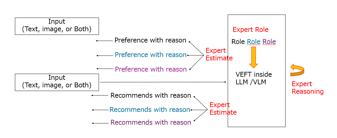 この生成AIを用いたレコメンド機能を実現するために前出のKADAを複数の専門家の知見を反映できるように拡張したのが、「VEFT(View-Effective Fine-Tuning)」である。これは同一LLMやVLMであっても、プロンプトで役割を設定することでマルチビューの視点を反映した挙動を示すことにヒントを得ており、KADA同様LLMだけでなくVLMにも適用可能だ。