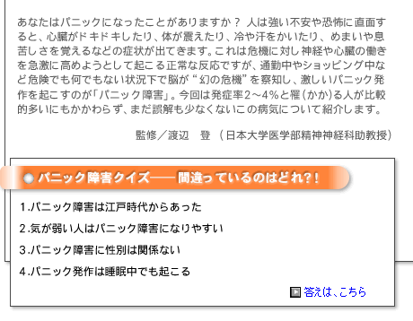 パニック障害は、ある日突然、何の前触れもなく襲ってくる「パニック発作」で発症する病気です。私達はちょっと慌てた時でも“パニック”という言葉を使いがちですが、この発作はそんな生やさしいものではありません。激しい動悸や息切れ、めまい、吐き気など複数の症状が同時に起こり、死への恐怖感も伴う大変つらいものなのです。症状は通常で30分以内、長い場合でも1時間以内に治まりますが、その後、繰り返し発作が起こるようになります。