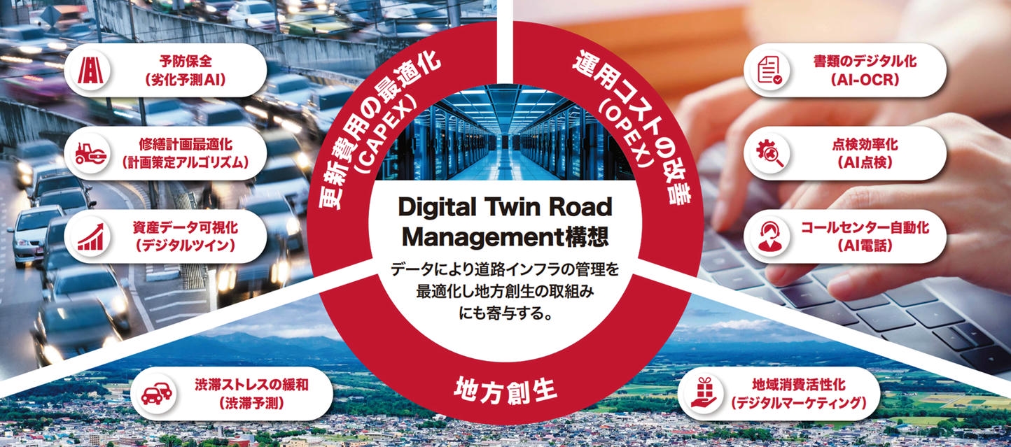本構想では、「運用コストの改善」「更新費用の最適化」「地方創生」の 3つの領域を設定し、Smart Data Fusion®で道路状態・交通量・コストなど多様なデータの収集・統合・分析を可能にすることで、道路維持管理業務の効率化・高度化や、劣化予測に基づくシミュレーションによる予防保全への転換、住民・利用者の満足度向上などに取り組んでいます。