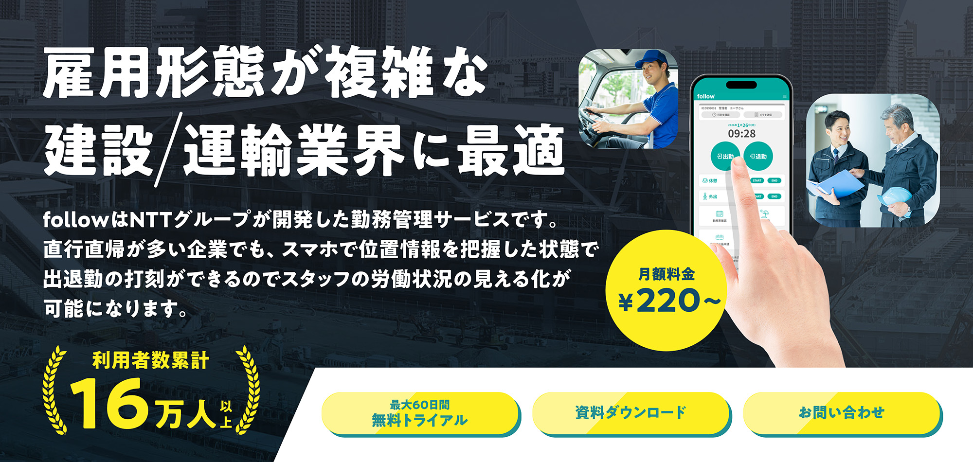 各拠点の勤務状況を「follow」で一元管理し、紙のタイムカード回収をゼロに。残業時間をリアルタイムで集計し、超過の兆しを早期に検知、適正な勤務管理を支援します。