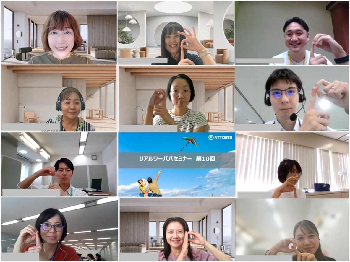 NTTデータグループでは、男性育休取得支援として「リアル・ワーパパセミナー」を開催。取得予定者や支援する上司が登壇し、実体験や職場づくりの工夫を共有。参加者から高い満足度を得ています。