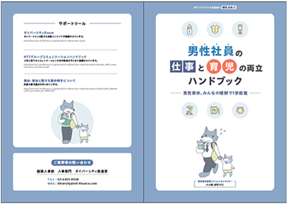NTTファイナンスでは、社内公募から誕生したマスコットキャラクター「パパ狼(ぱぱろう)」が、育休取得を応援する象徴として活躍。父親や仲間と協力して子育てをする“狼”をモチーフに、ハンドブックや動画などで社員の思いを発信しています。