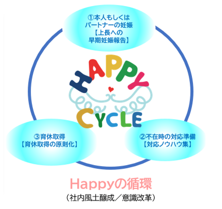 NTT東日本では、妊娠時の早期報告、育休対応ノウハウの共有、男性社員の育休取得の原則化という一連の行動を「Happy Cycle」と名付け、社内運動として定着を図っています。社員の不安を軽減し、職場全体で育休を支える風土づくりをめざしています。